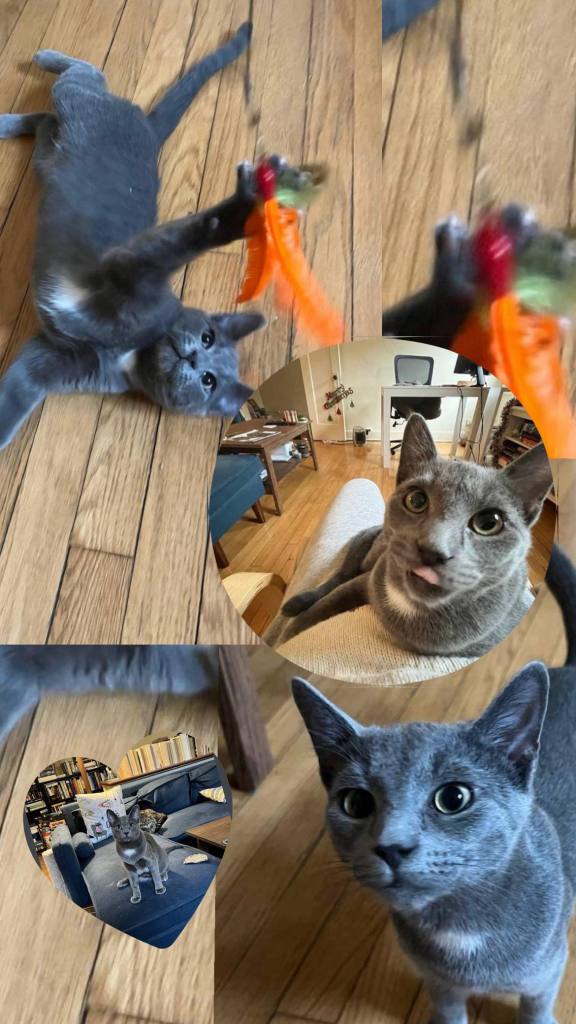 Then Heathcliff (1) arrived. He was young, full of energy, and always moving, his paws skittering on the wood floors, his bell jingling down the hall. With him, the apartment changed. I had to make sure Chachi’s peace wasn’t disturbed while Heathcliff played somewhere else. The apartment became a lesson in managing a household: moving toys, closing doors, splitting my attention, and listening for the distant crash of something knocked over in the next room. Chachi kept to her space, curling into the velvet dip of her couch, and Heathcliff made his own kind of mess, scattering dry food and leaving tufts of fur on the rugs. The two cats mostly stayed apart, and I found myself in the middle, a bridge between old routines and new chaos. Over time, I realized I was changing too, learning patience, becoming attuned to the shifting moods of the apartment, and noticing that I felt less like a visitor and more like a steady presence in their small world.